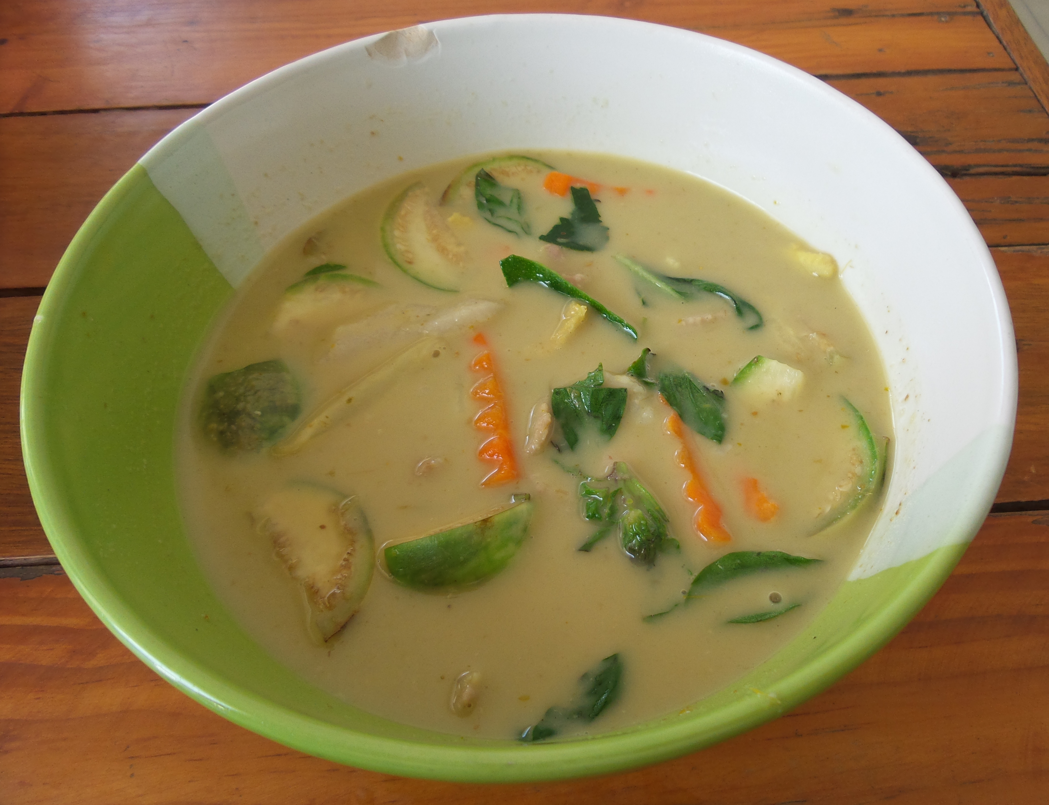 Gang Keow Wan – Thai green curry. Green curry paste, coconut milk, chicken, bamboo shoots, Thai herbs, and eggplant.