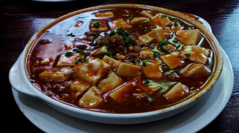 Mapo Tofu, einer unserer Lieblingsspeisen in China, Szechuan Küche, Der Name bedeutet Tofu nach Art der pockennarbigen alten Frau, ok klingt nicht so toll, aber schmeckt vorzüglich, Soft Tofu mit Hackfleischsoße schön scharf und würzig.