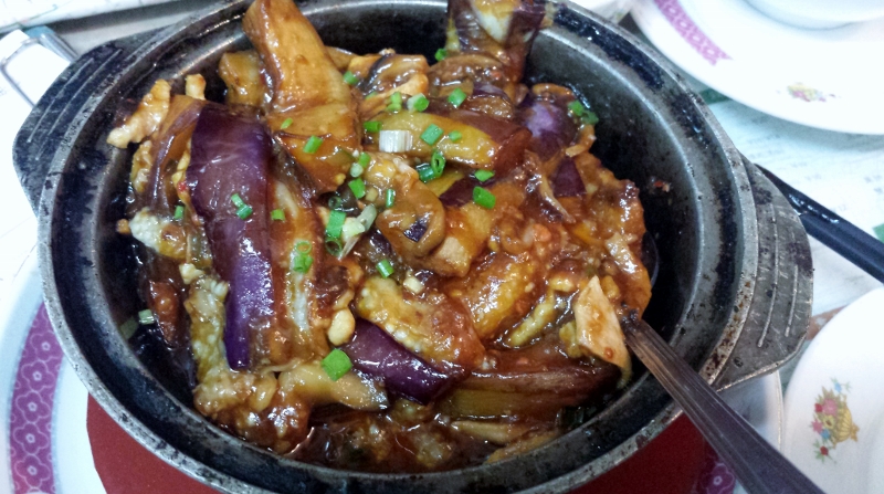 Szechuan Auberginen, hier werden die länglichen lilafarbenen Thai-Auberginen verwendet, wunderbar abgeschmeckt mit Essig und Zucker, schön karamellisiert und überhaupt nicht scharf. Das ganze wird im Tontopf geschmort und serviert.