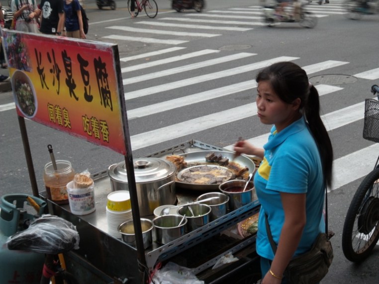 Überall in der Stadt gibt es kleine mobile Essensstände. Da unterscheidet sich China nicht von Thailand. Hier wird Stinky Tofu angeboten. Nichts für unsere Nasen!