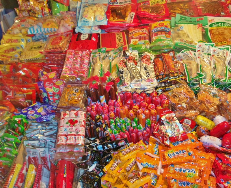 So schön bunt. Ganz viele Knabbereien auf einem Haufen.