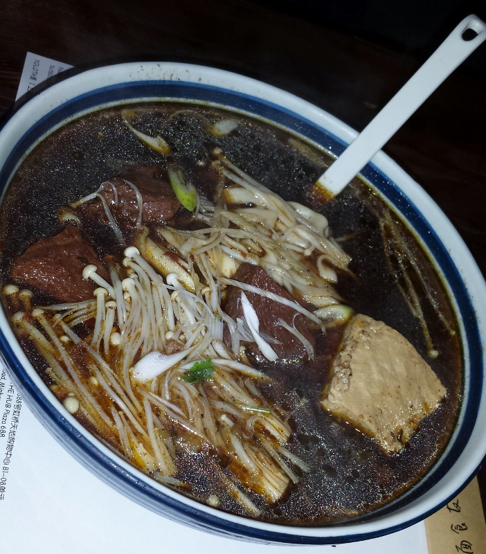 Rindfleischsuppe sehr kräftig. Vorsicht hier versteckt sich gerne mal ein „Stinky Tofu“. Das Quadrat rechts unten. Die Pilze sind Enoki (Gemeiner Samtfußrübling). Der Pilz hängt einem mit seinen langen Stielen gerne mal zwischen den Zähnen.
