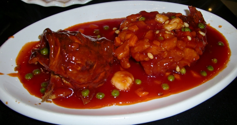 Mandarin Fisch, Knusprig frittierter Fisch ohne Gräten, Ananas, Erbsen und süß saurer Sauce. Besonders dabei ist, dass der Kopf und die Schwanzflosse nach oben gebogen werden, damit der Fisch einem Eichhörnchen gleicht.