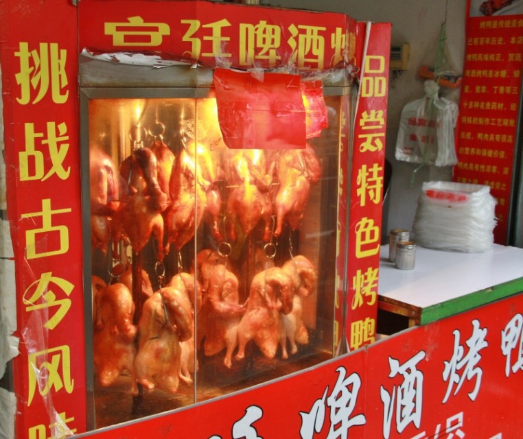 Überall wird gegrillt. Hier gibt es nicht die Hähnchen sondern die Enten.