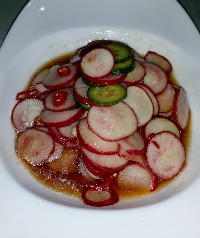 Eine würzig, scharfe Erfrischung. Radieschensalat mit Gurken.