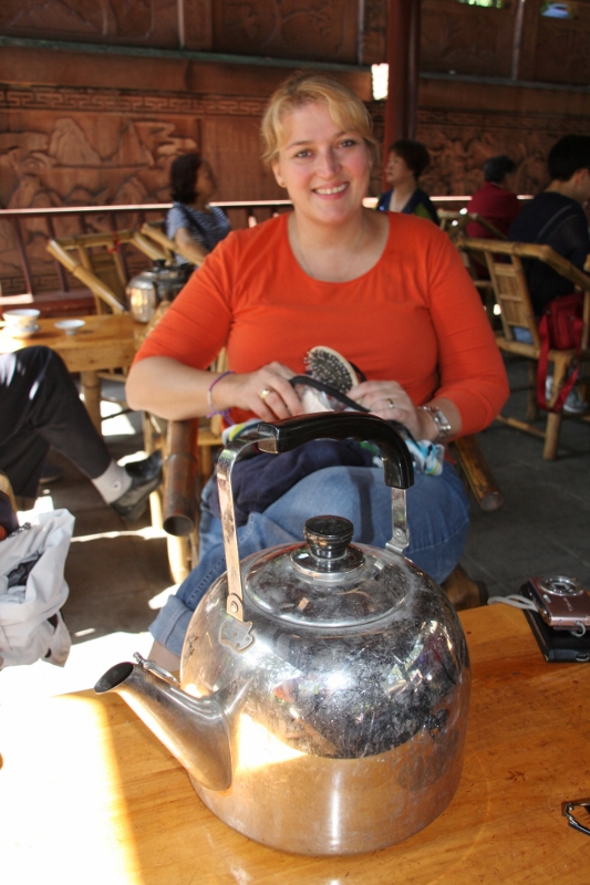 Auch wir haben uns dazugesellt und genießen den guten chinesischen Tee. Der große Kessel steht zum auffüllen der Teetassen mit heißem Wasser bereit.