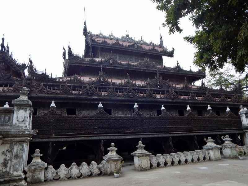 Shwenandaw Kyaung. Das Teakholzgebäude stand bis 1880 im Königspalast und diente dort als Königsgemach. König Thibaw ließ es 1880 nach dem Tod von König Mindon abreißen und als Kloster außerhalb der Palastmauern wieder aufbauen. Es ist somit das einzige original erhaltene Palastgebäude.
