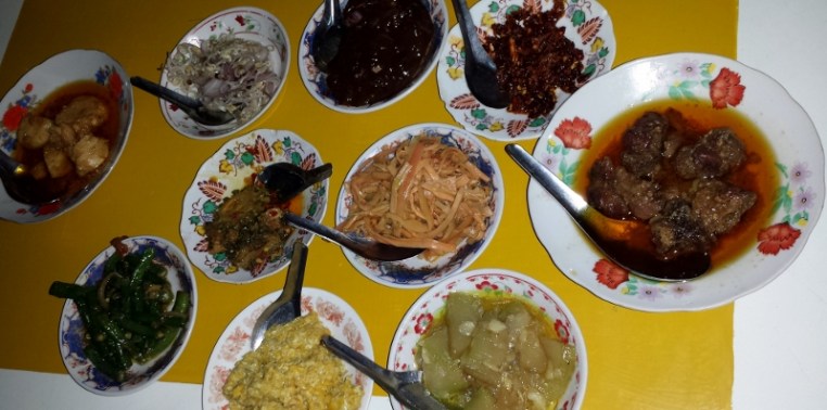 Klassisches burmesisches Gedeck; viel Gemüse und Salate und dazu ein Curry.