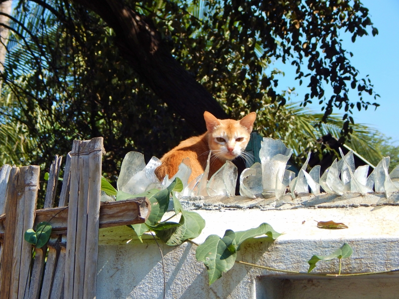 Eine Katze lugt über den mit Glasscherben bestückten Zaun.