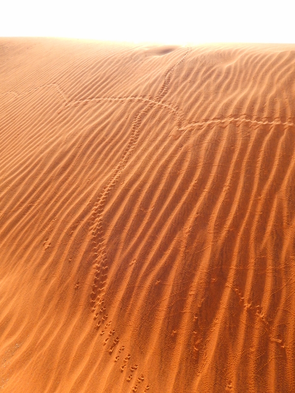 Spuren im Sand. Neben abgestorbenen Bäumen gibt es durchaus noch Leben in Form von Pflanzen und Tieren im Sossusvlei. Neben Schlangen, Geckos, Vögeln und Antilopen findet man auch Akazien und Gräser in dieser Gegend.