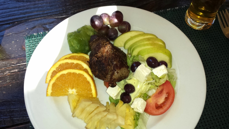 In Joe’s Bierhaus in Windhoek gab leckere Steaks. Und für die Mädels nicht mit Pommes, sondern wahlweise mit Obstsalat. Ganz meine Wahl.