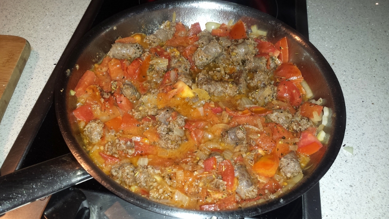 Die Namibische „Bratwurst“ Boerewors genannt läßt sich auch hervorragend in der Pfanne mit Tomaten zubereiten. Dazu lecker Reis. Fertig ist das Abendessen.