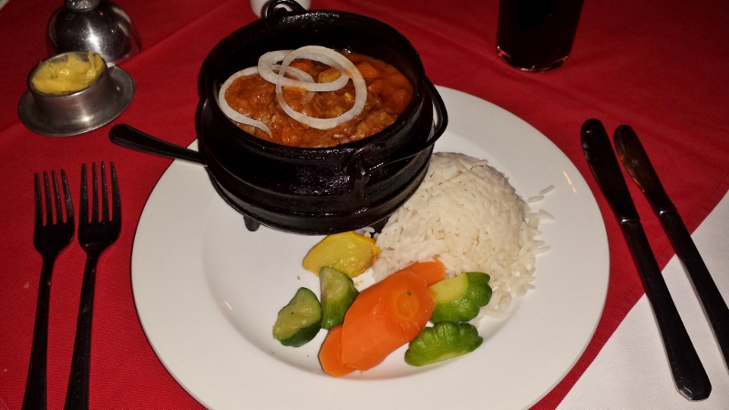 Hier ein weiteres typisches Essen. Der Potjie. Das Essen wird über dem Feuer zubereitet in einem gusseisernen Topf (Potjie).