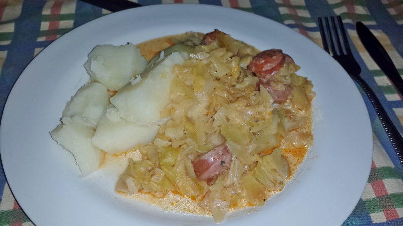 Weißkohl mit afrikanischen Mettenden und Kartoffelbrei.