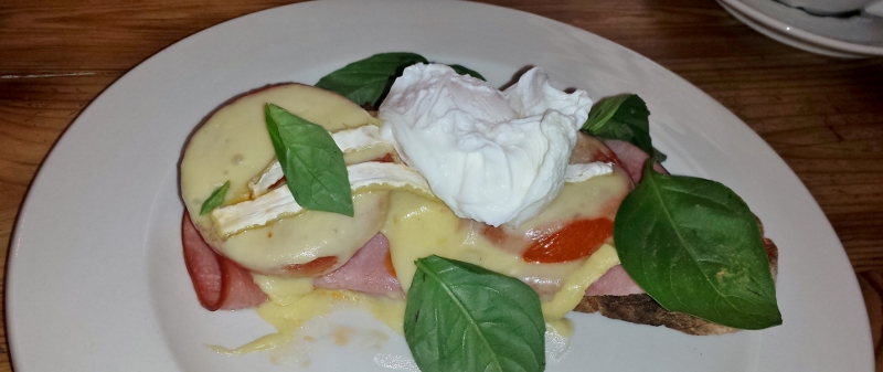 Ein tolles Baguette. Mit Schinken, Tomaten, Käse und pochiertem Ei.