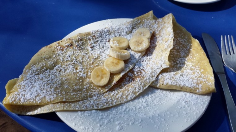 Frühstück auf dem Campingplatz von Susanne. Lecker Pfannkuchen mit Banane.