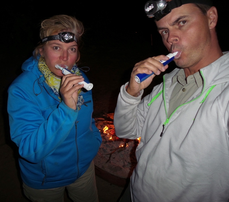 Zeltplatz in der Wildnis ohne Strom und Wasser. Dann eben Zähneputzen am Lagerfeuer.